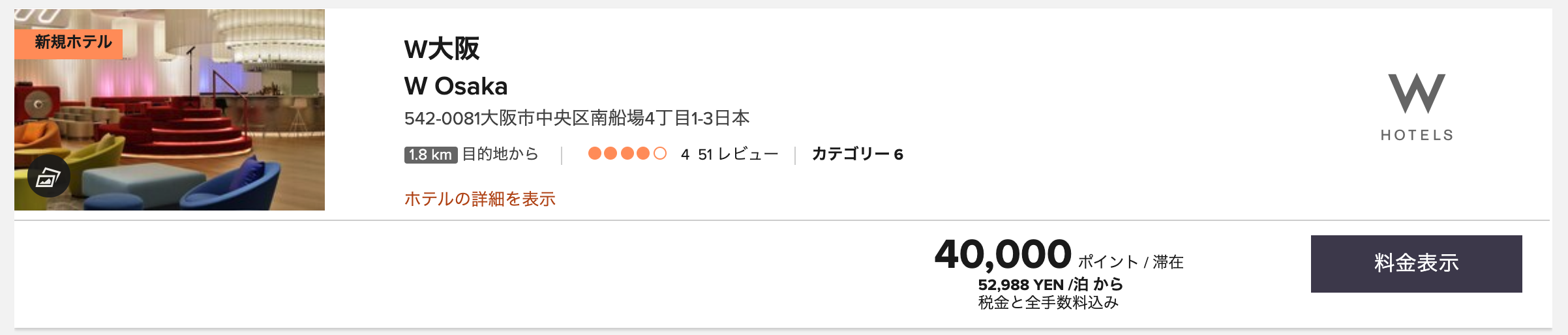 W大阪であれば、40,000ポイントで宿泊ができます。