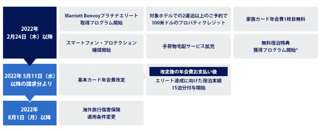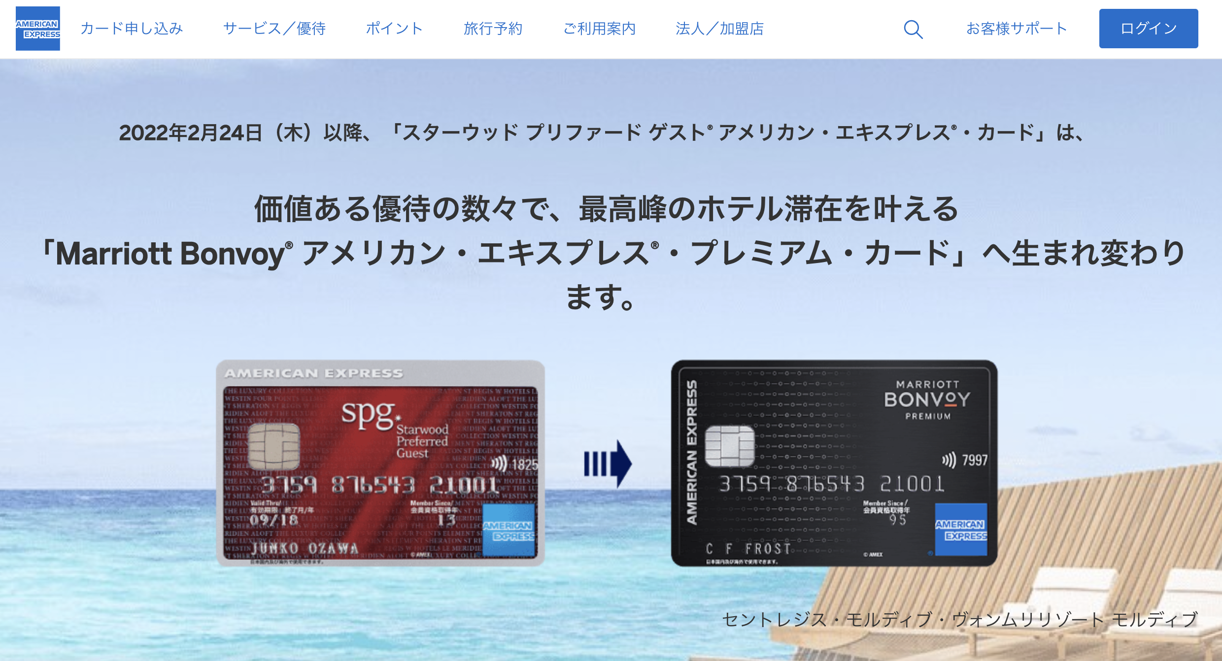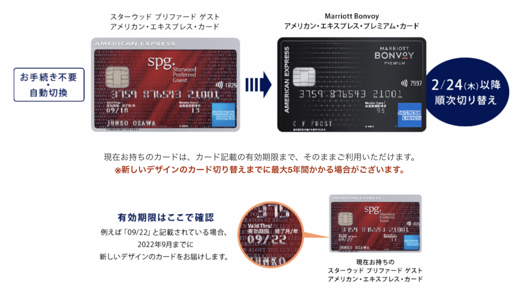 現在SPGアメックスをお持ちの方は、2022年2月24日以降は特典、サービスはマリオットアメックスプレミアムが適用されます。有効期限が来るまでは券面はSPGアメックスのままになります。