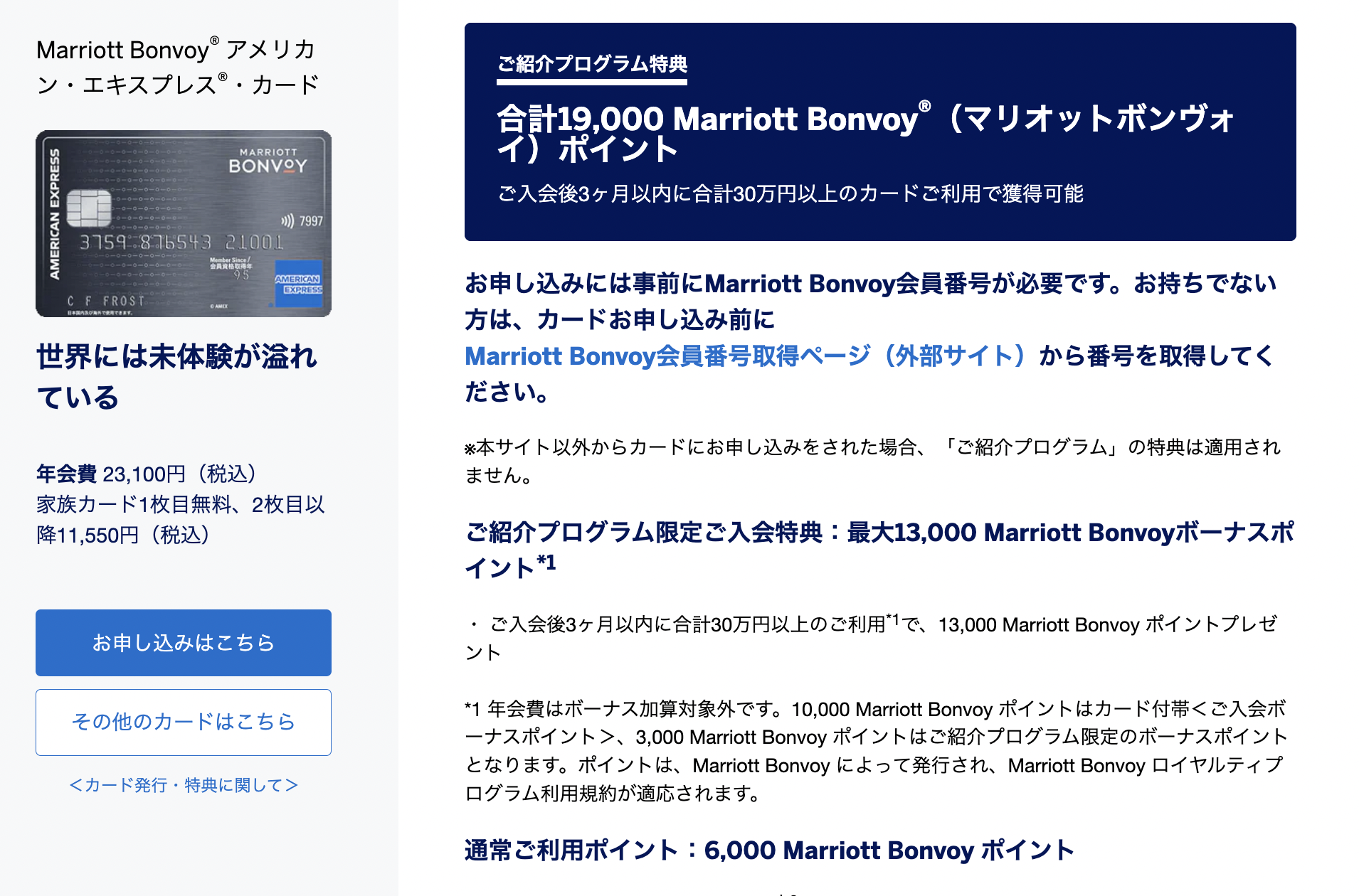 プレミアムではないMarriott Bonvoyアメックスの紹介も可能です。最大19,000ポイントが貰えます!