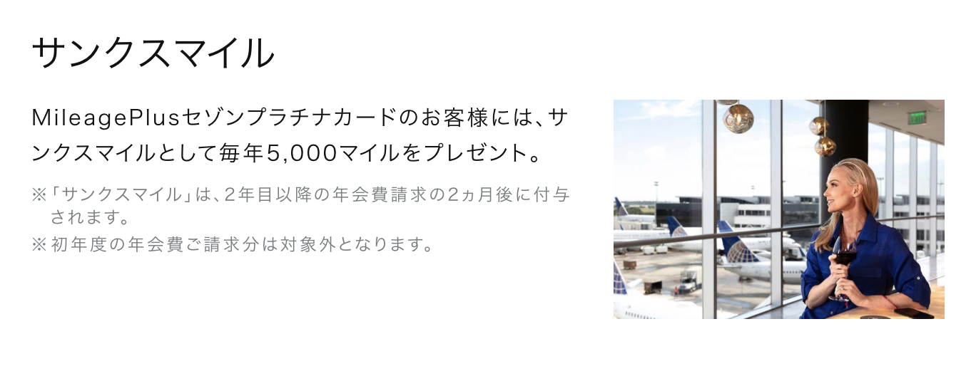 また初年度は対象外ではありますが、2年目以降は年会費請求の2ヶ月後に5,000マイルがサンクスマイルとして付与されます。