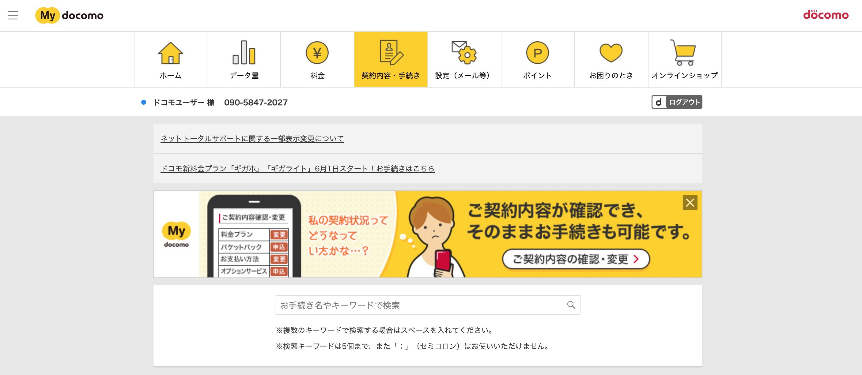 IDとパスワードを入力してログインすると、上記のような画面になるので、上のタブから「契約内容・手続き」を選択します。