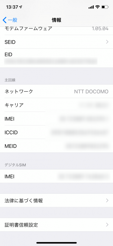 iPhoneの場合、[設定]→[一般]→[情報]から確認ができます。「デジタルSIM」のIMEI番号をそのまま入力します。