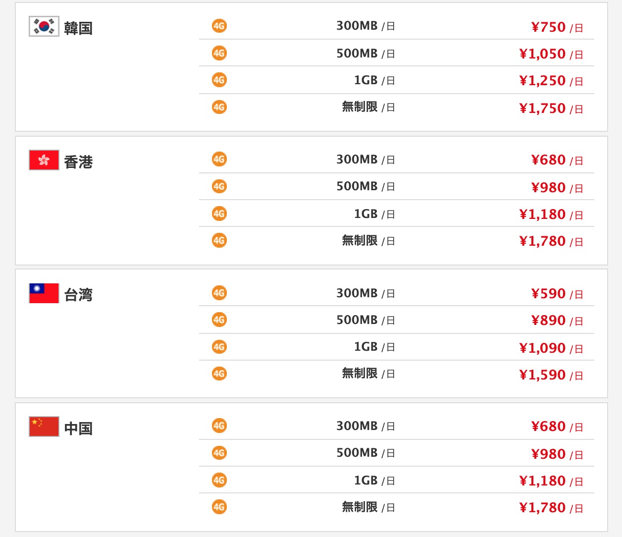 料金は、滞在国によって異なりますが、日本人観光客の多い台湾では1日380円でレンタルが可能です。そのほか東南アジアでは、中国や香港で680円、韓国は750円です。