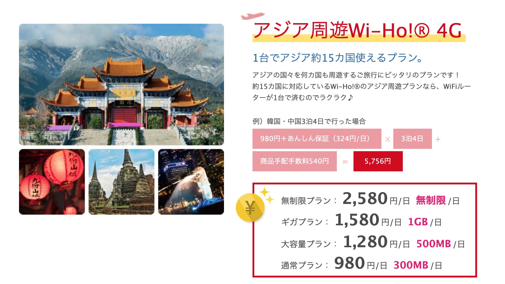 Wi-Ho!Wi-Fiには周遊プランがあり、アジア周遊プランが1日980円から、ヨーロッパ周遊プランが1日1,180円から利用できます。