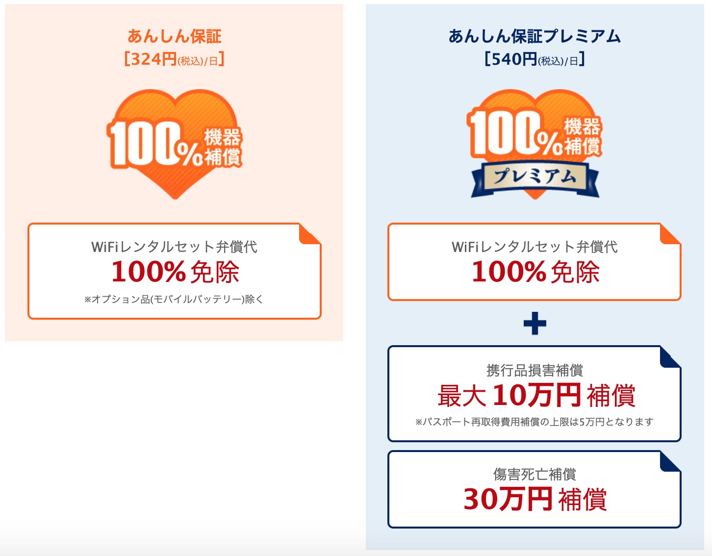 旅行先でWi-Fiルーターを破損させてしまった、紛失してしまったときに発生する弁償代金が免除となる安心保証が1日300円(税抜)で加入することができます。