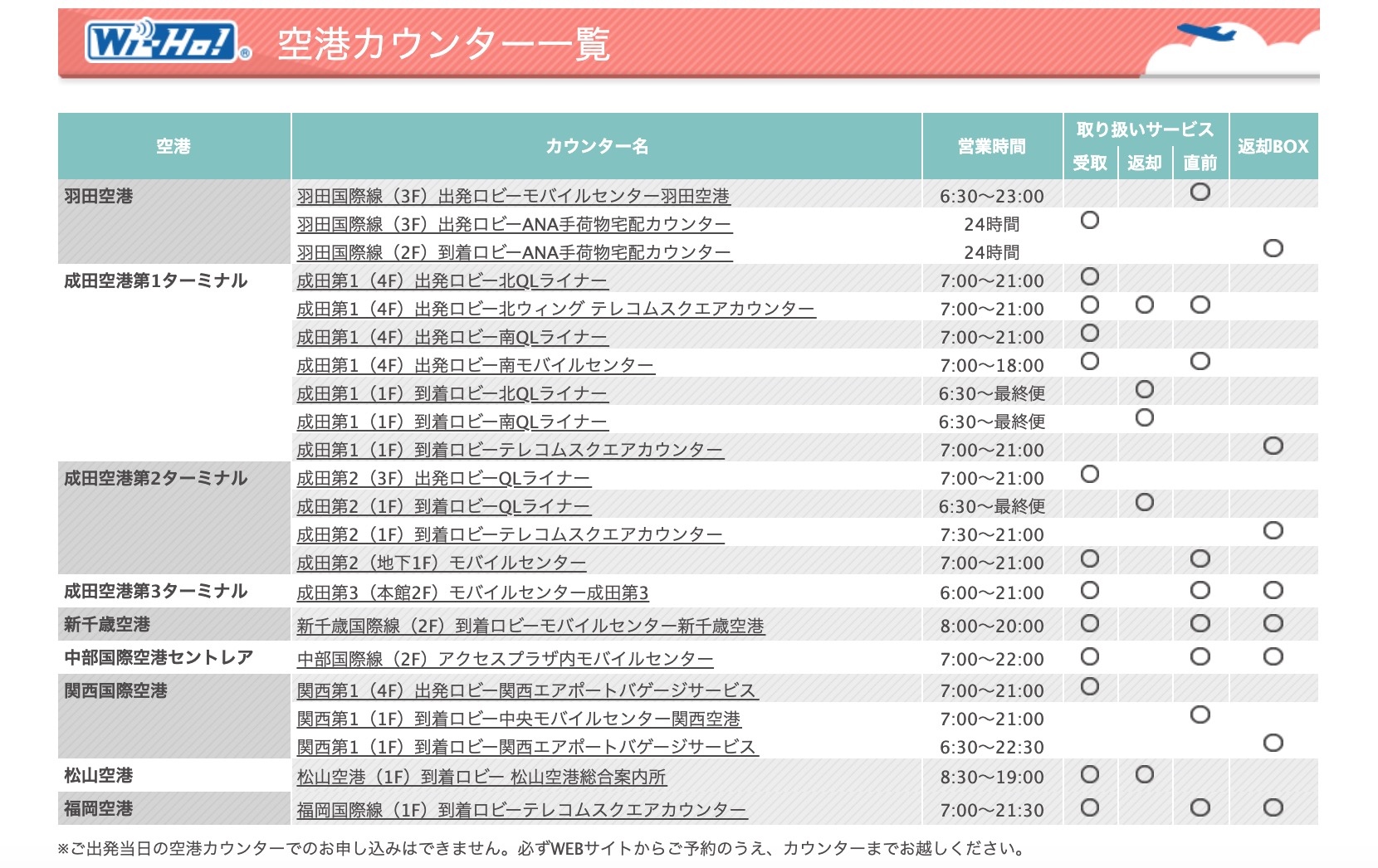 返却については、空港ではカウンターに直接返すか、成田・羽田・新千歳・中部・関西・福岡空港では返却BOXに投函するだけです。