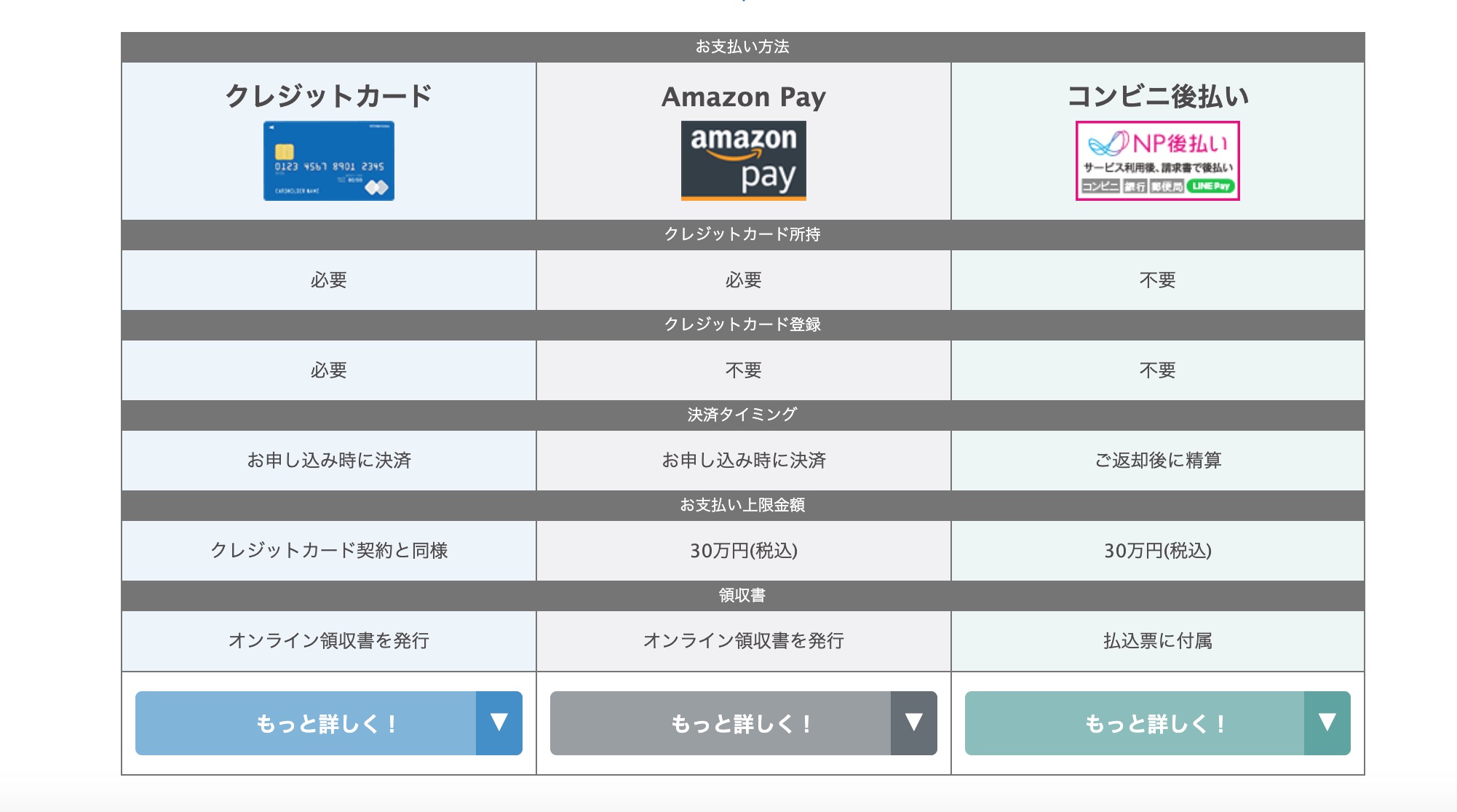 支払い方法はクレジットカード、Amazon Payのほかにコンビニ後払いがあり、クレジットカードを持っていなくても利用することができます。
