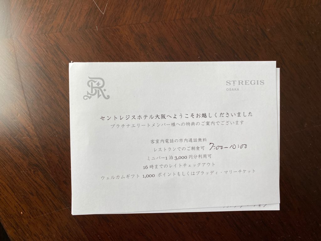 プラチナエリートメンバーの場合、セントレジス大阪では以下の特典が受けられます。残念ながらクラブラウンジはありませんので、必然的にラウンジアクセスの特典は使えません。ラウンジ目的であればマリオット都ホテル、リッツ・カールトン大阪が良いでしょう。